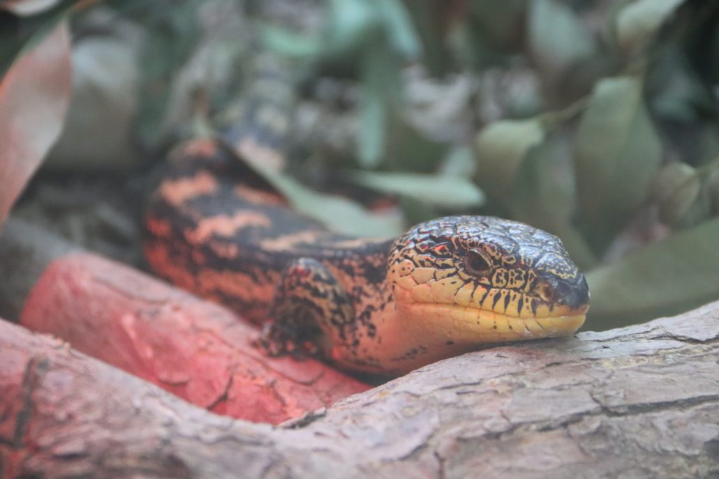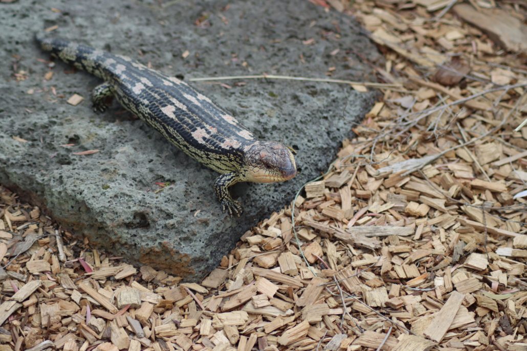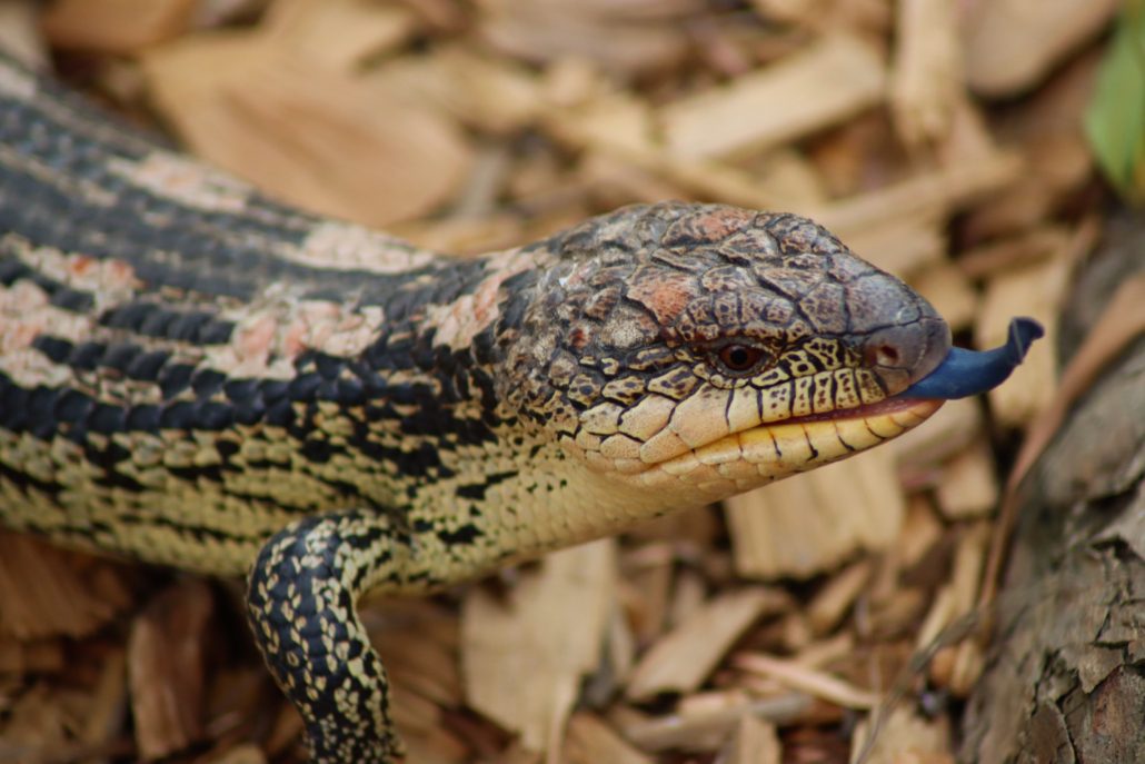 Blotched blue tongues are dark brown with light coloured blotches across the back, they have a long body, large head and tail that tapers to a point. Blue tongues live in areas with lots of groundcover such as leaf litter, sheltering under logs and rocks.